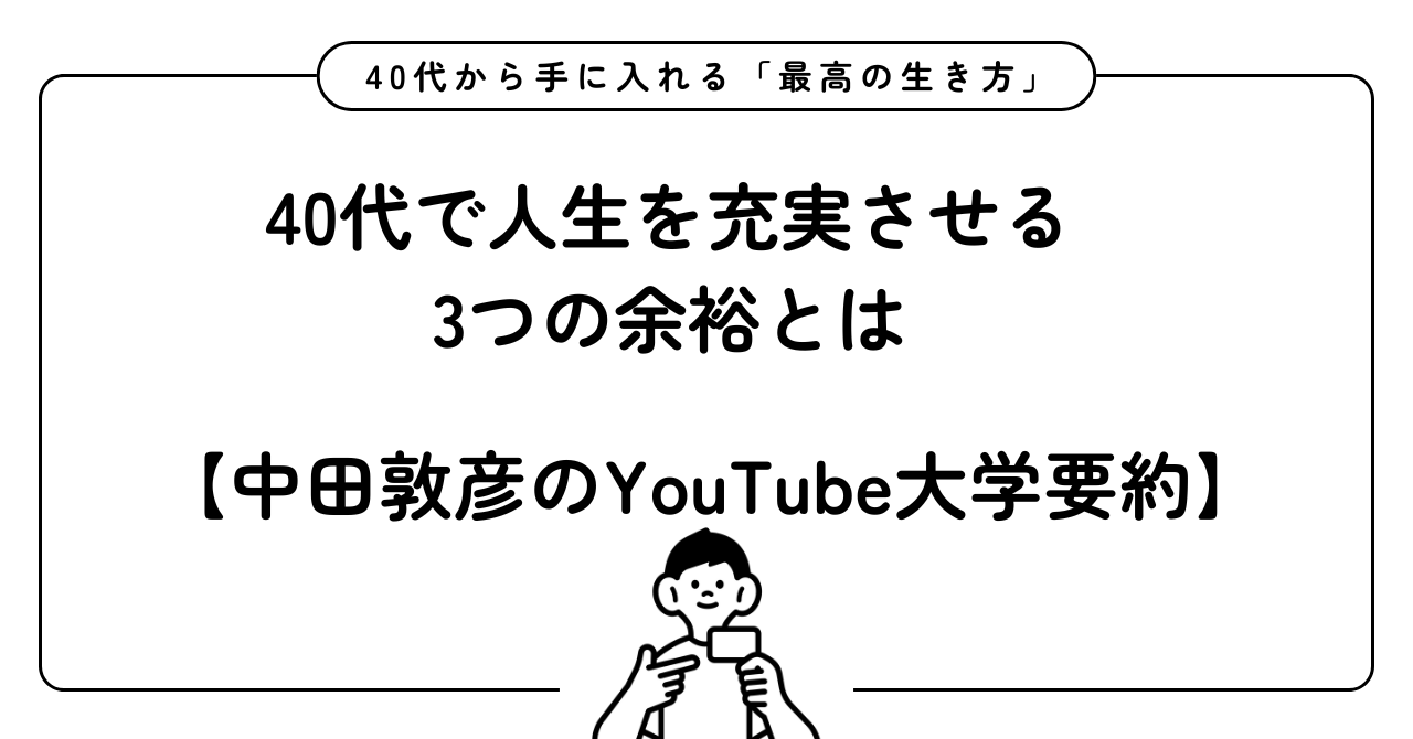 40代になると、これまでの経験を活かして「やりたいこと」を自由にできる時期がやってきます。中田敦彦さんのYouTubeチャンネル「中田敦彦のYouTube大学 – NAKATA UNIVERSITY」では、40代からの最高の生き方を具体的に解説しています。本記事では動画シリーズ【①人生は40代から花開く・②お金と時間の使い方&しないことリスト】の内容をわかりやすくまとめました。