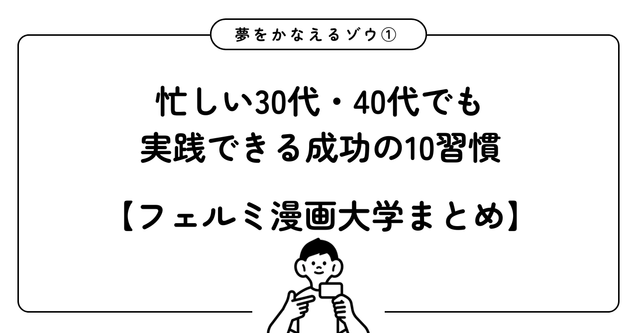今回ご紹介するのは、フェルミ漫画大学で紹介された水野敬也氏のベストセラー小説**『夢をかなえるゾウ』の第1巻。物語は、うだつの上がらないサラリーマンがゾウの姿をした神様・ガネーシャと出会い、成功のヒントをもらうという内容です。今回はその中で登場する、忙しいあなたでも実践できる10の成功習慣**を解説します。