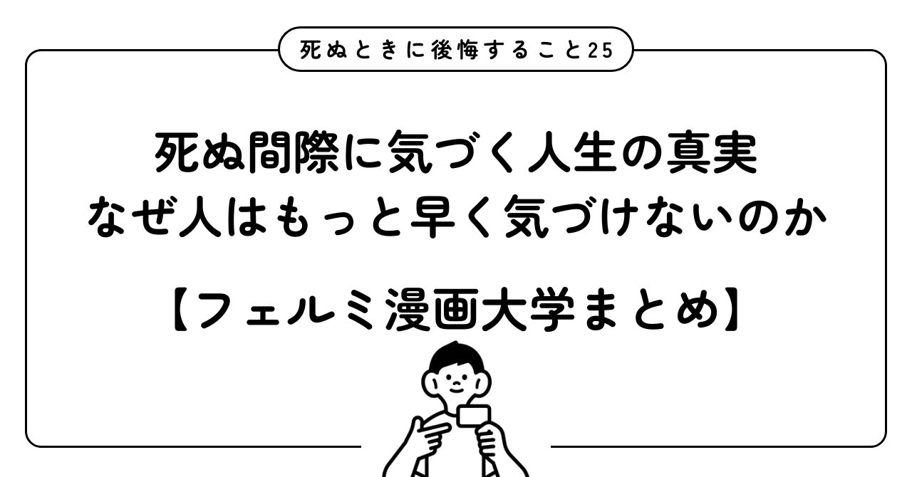 今回ご紹介するのは、フェルミ漫画大学で解説された医師である大津秀一先生の著書 『死ぬときに後悔すること25』 の動画の内容です。
